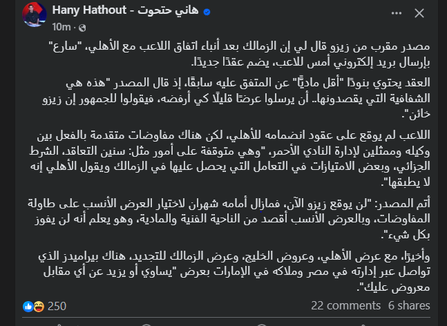 تحيا مصر، وكتبت هاني حتحوت عبر حسابه الرسمي"فيس بوك": مصدر مقرب من زيزو قال لي إن الزمالك بعد أنباء اتفاق اللاعب مع الأهلي، "سارع" بإرسال بريد إلكتروني أمس للاعب، يضم عقدًا جديدًا".