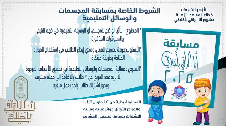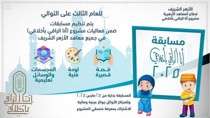 أعلن قطاع المعاهد الأزهرية برئاسة فضيلة الشيخ أيمن عبد الغني، عن تنظيم ثلاث مسابقات إبداعية متنوعة ضمن فعاليات الموسم الثالث من مبادرة «أنا الراقي بأخلاقي»، الذي ينظمها قطاع المعاهد على مستوى مختلف الجمهورية .