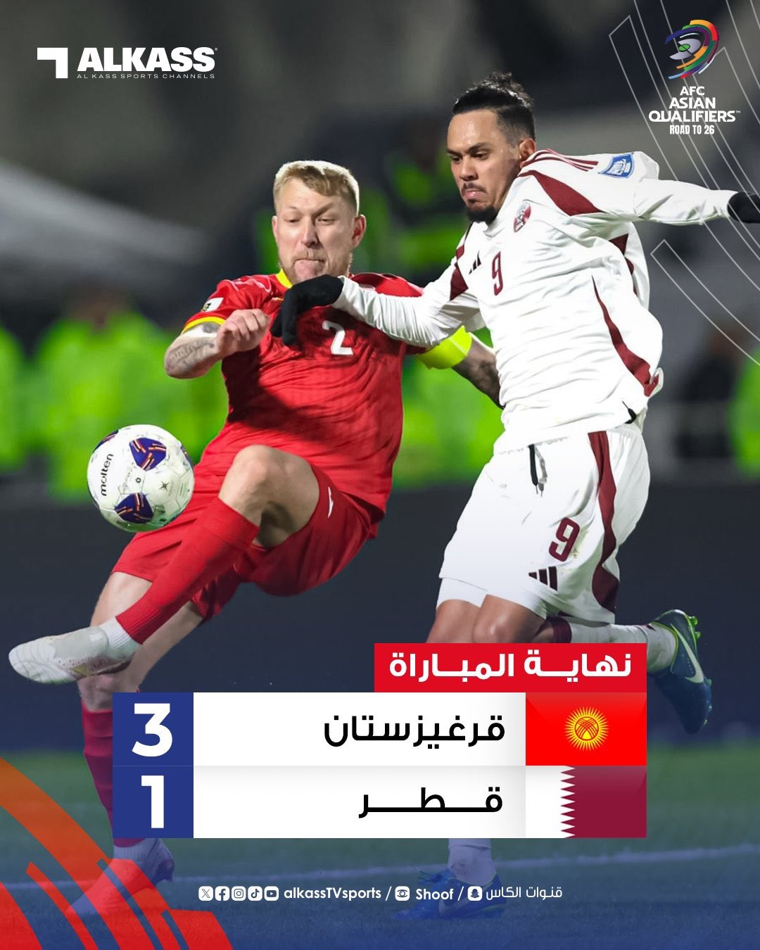 وحقق منتخب قزغيزستان فوزًا عريضًا أمام المنتخب القطري بنتيجة (3-1) على ستاد سبارتاك في اطار مباريات الجولة الثامنة من دور المجموعات من عمر التصفيات الأسيوية المؤهلة لبطولة كأس العالم 2026 بالولايات المتحدة الأمريكية وكندا والميكسيك.
