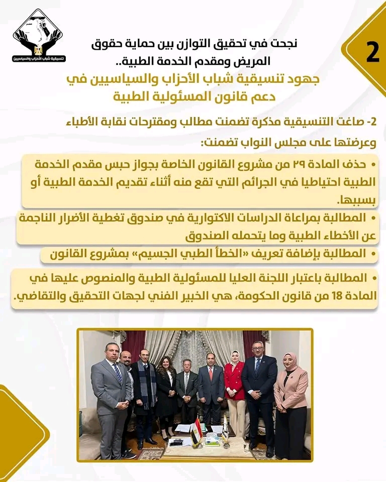 . استقبلت التنسيقية في ۲۸ ديسمبر ٢٠٢٤ نائب رئيس مجلس الوزراء وزير الصحة والسكان في حوار مفتوح مع «التنسيقية» حول قانون المسؤلية الطبية.