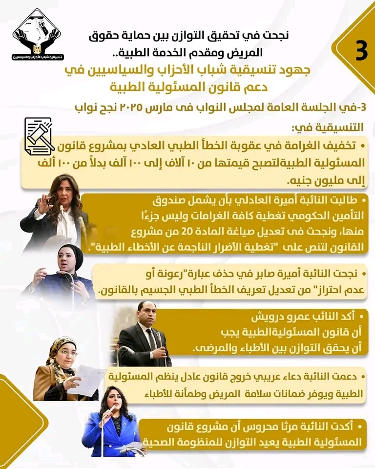 نشرت تنسيقية شباب الأحزاب والسياسيين انفوجراف يتضمن جهودها في دعم قانون المسئولية الطبية وسلامة المريض الذي أقره مجلس النواب نهائيا أمس.