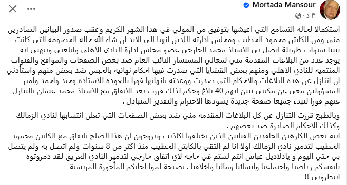 استكمالا لحالة التسامح التي اعيشها بتوفيق من المولى في هذا الشهر الكريم وعقب صدور البيانين الصادرين مني ومن الكابتن محمود الخطيب ومجلس ادارته اللذين أنهيا الي الابد ان شاء الله حالة الخصومة التي كانت بيننا سنوات طويلة.