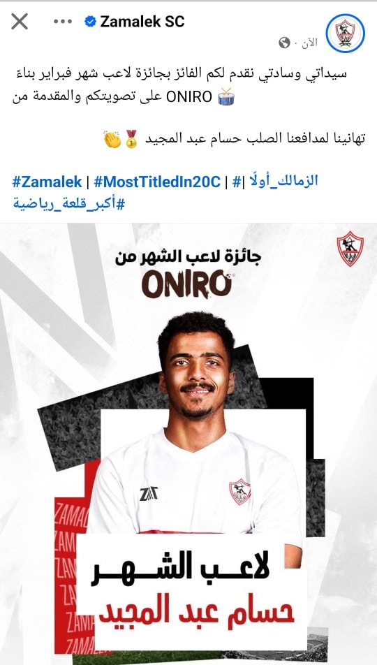 وقالت الصفحة الرسمية لنادي الزمالك على فيس بوك، سيداتي وسادتي نقدم لكم جائزة لاعب شهر فبراير بناء على تصويتكم والمقدمة من أونيرو، تهانينا لمدافعنا الصلب حسام عبد المجيد.