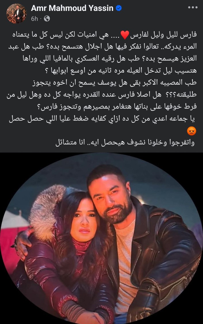 وكتب السيناريست عمرو محمود ياسين منشور عبر حسابه الرسمي على موقع التواصل الاجتماعي فيسبوك تحدث فيه عن نهاية مسلسل وتقابل حبيب التي أثارت حيرة الجمهور، وعلق عليها محيرًا الجمهور بشكل أكبر حول زواج فارس وليل اللذان يقدمان شخصيتهم كريم فهمي وياسمين عبد العزيز، وكتب عمرو محمود ياسين في المنشور الذي يرصده موقع تحيا مصر: "فارس لليل وليل لفارس.. هي أمنيات لكن ليس كل ما يتمناه المرء يدركه.. تعالوا نفكر فيها هل اجلال هتسمح بده؟ طب هل عبد العزيز هيسمح بده؟ طب هل رقيه العسكري بالمافيا اللي وراها هتسيب ليل تدخل العيله مره ثانيه من اوسع ابوابها ؟ طب المصيبه الاكبر بقى هل يوسف يسمح ان اخوه يتجوز طليقته؟ هل اصلا فارس عنده القدره يواجه كل ده وهل ليل من فرط خوفها على بناتها هتغامر بمصيرهم وتتجوز فارس؟.. يا جماعه اعدي من كل ده ازاي كفايه ضغط عليا اللي حصل حصل واتفرجوا وخلونا نشوف هيحصل ايه.. انا متشائل"، وانهالت التعليقات على منشور عمرو محمود ياسين من الجمهور الذي يترقب التعرف على نهاية الحلقات.
