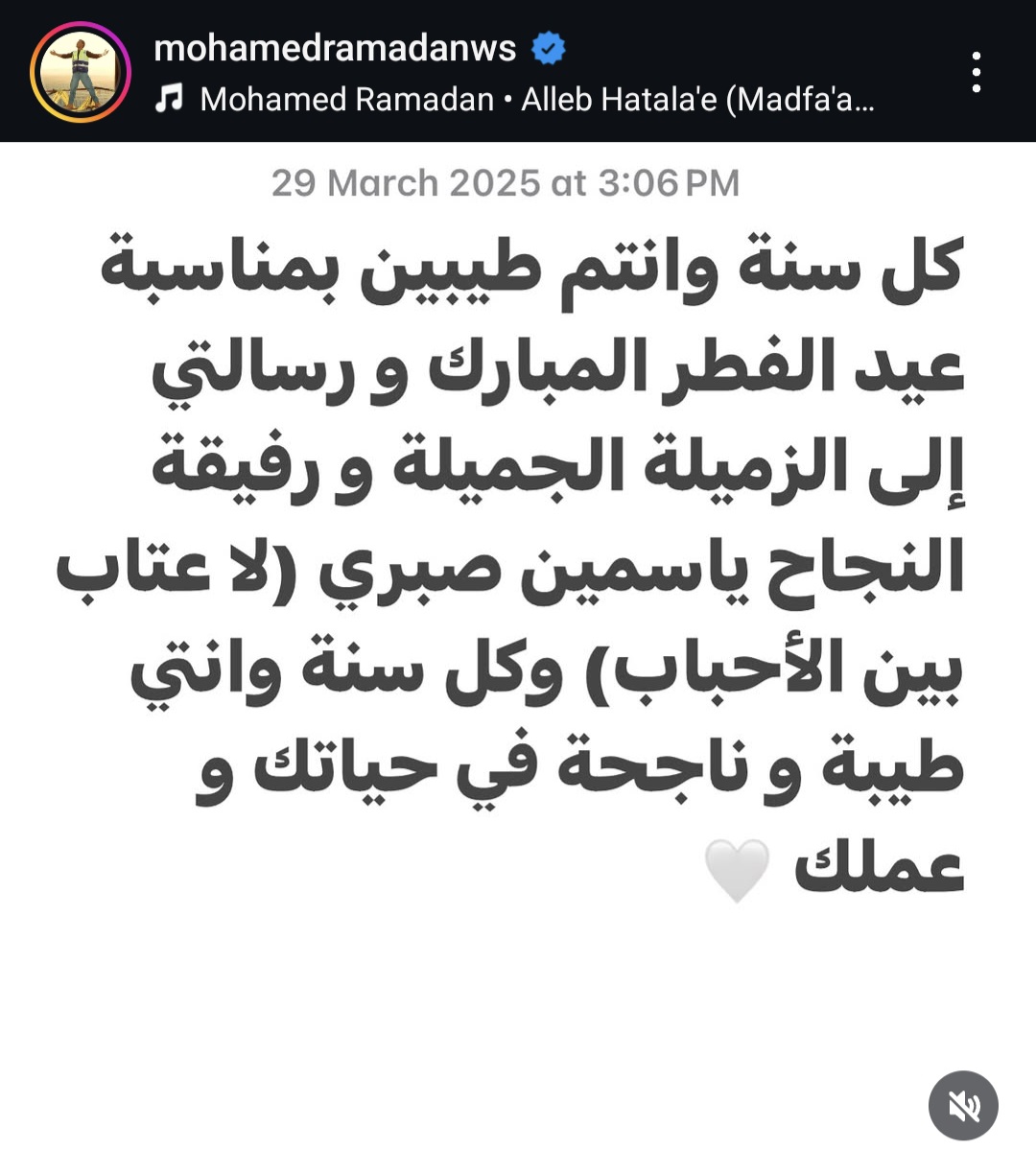 وكتب محمد رمضان في منشوره الذي يرصده موقع تحيا مصر: كل سنة وانتم طيبين بمناسبة عيد الفطر المبارك و رسالتي إلى الزميلة الجميلة و رفيقة النجاح ياسمين صبري لا عتاب بين الأحباب وكل سنة وانتي طيبة وناجحة في حياتك وعملك.