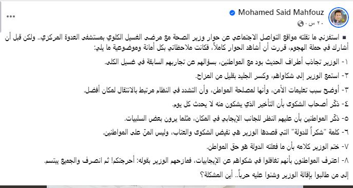 "استفزني ما نقلته مواقع التواصل الاجتماعي عن حوار وزير الصحة مع مرضى الغسيل الكلوي بمستشفى العدوة المركزي.. ولكن قبل أن أشارك في حملة الهجوم، قررت أن أشاهد الحوار كاملاً، فكانت ملاحظاتي بكل أمانة وموضوعية ما يلي: