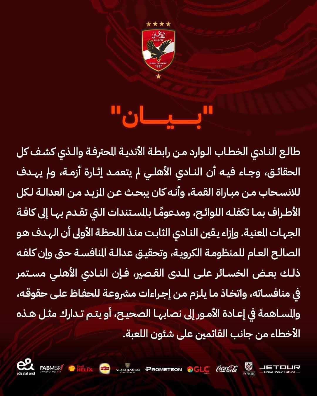 وجاء في بيان النادي الأهلي، طالع النادي الأهلي الخطاب الوارد من رابطة الأندية المحترفة والذي كشف كل الحقائق وجاء فيه أن النادي الأهلي لم يتعمد إثارة أزمة ولم يهدف للانسحاب من مباراة القمة.