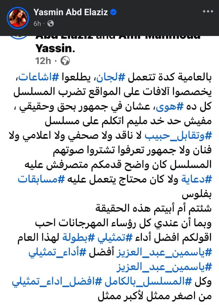وقالت ياسمين عبد العزيز في منشورها الذي يرصده موقع تحيا مصر والذي يؤكد على نجاح وتقابل حبيب و ردت من خلاله على كافة المنتقدين: "بالعامية كدة تتعمل لجان يطلعوا اشاعات يخصصوا آلافات على المواقع تضرب المسلسل كل ده هوی، عشان في جمهور بحق وحقيقي ، مفيش حد خد مليم اتكلم على مسلسل وتقابل حبيب لا ناقد ولا صحفي ولا اعلامي ولا فنان ولا جمهور تعرفوا تشتروا صوتهم المسلسل كان واضح قدمكم متصرفش عليه دعاية ولا كان محتاج يتعمل عليه مسابقات بفلوس شئتم أم أبيتم هذه الحقيقة".