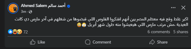 تحيا مصر، وكتب أحمد سالم المتحدث الرسمي للزمالك عبر حسابه الرسمي"فيس بوك":" أكبر غلط وقع فيه معظم المصريين أنهم افتكروا الفلوس اللي قبضوها من شغلهم في آخر مارس دي كانت العيدية، مش مرتب مارس اللي هيعيشوا منه طول شهر أبريل".