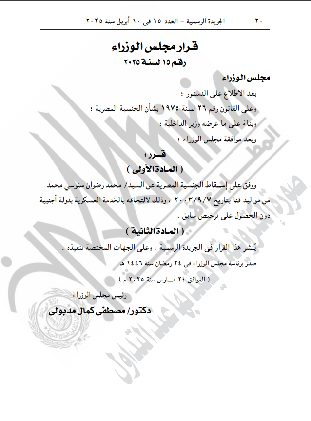 أصدر الدكتور مصطفى مدبولي رئيس مجلس الوزراء قرارًا، نشرته الجريدة الرسمية في عددها الصادر اليوم، بإسقاط الجنسية المصرية عن محمد رضوان سنوسي محمد.