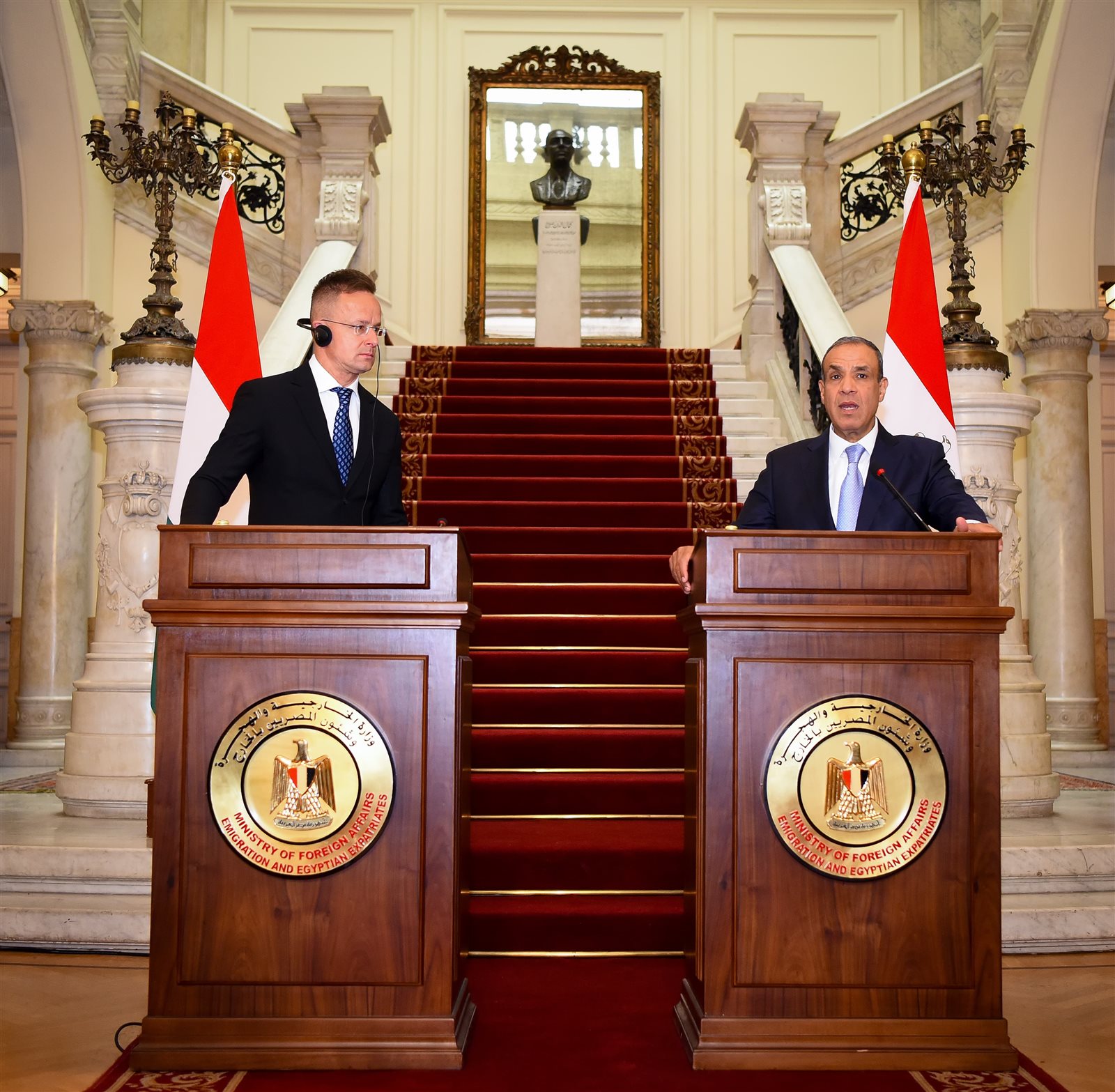 وأشاد وزير الخارجية والتجارة بدولة المجر بيتر سيارتو، بالجهود التي تبذلها مصر لإحلال السلام في منطقة الشرق الأوسط، مشيراً إلى الجهود التي بذلتها مصر من أجل إعادة مجريين من قطاع غزة إلى بلادهم.