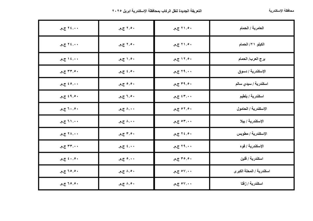 محافظة الإسكندرية تعتمد تعريفة الركوب الجديدة لوسائل النقل بعد الزيادة الجديدة