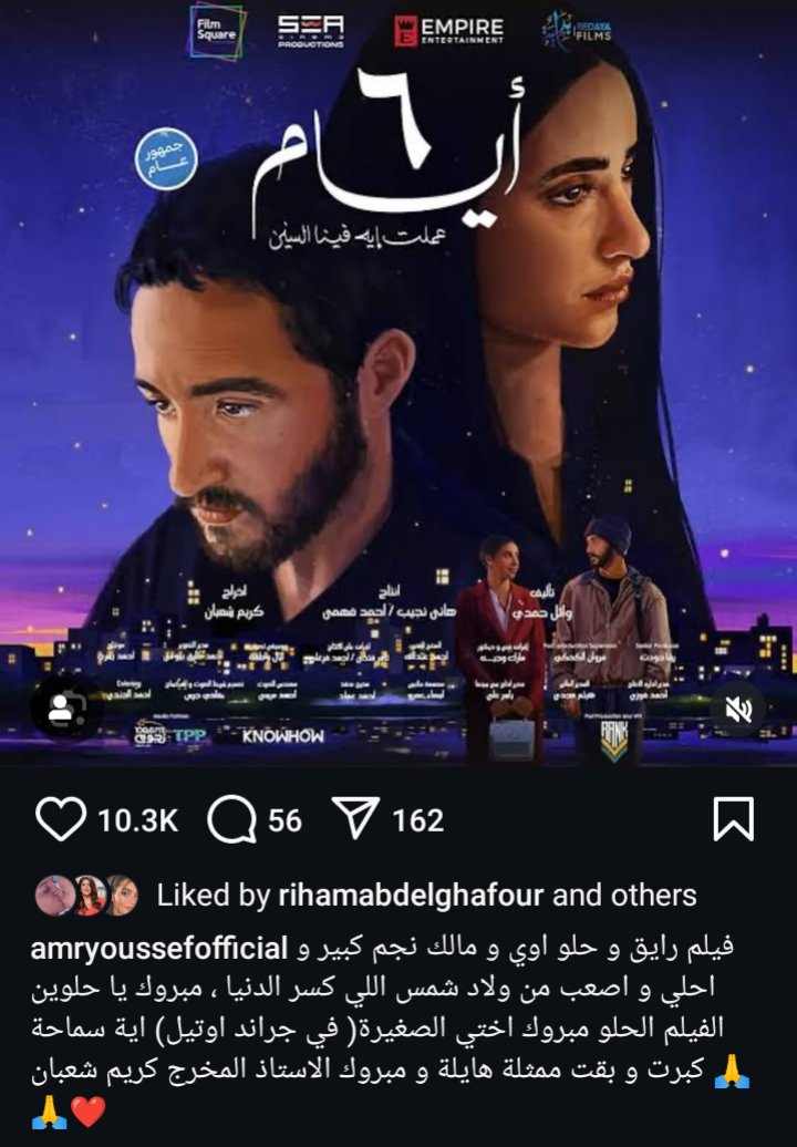 ونشر عمرو يوسف بوستر فيلم 6 أيام على حسابه الرسمي بموقع تبادل الصور والفيديوهات انستجرام، في منشور رصده موقع تحيا مصر منذ قليل، وعلق عليه قائلا: فيلم رايق و حلو اوي و مالك نجم كبير و احلي و اصعب من ولاد شمس اللي كسر الدنيا ، مبروك يا حلوين الفيلم الحلو مبروك اختي الصغيرة( في جراند اوتيل) اية سماحة كبرت و بقت ممثلة هايلة و مبروك الاستاذ المخرج كريم شعبان.