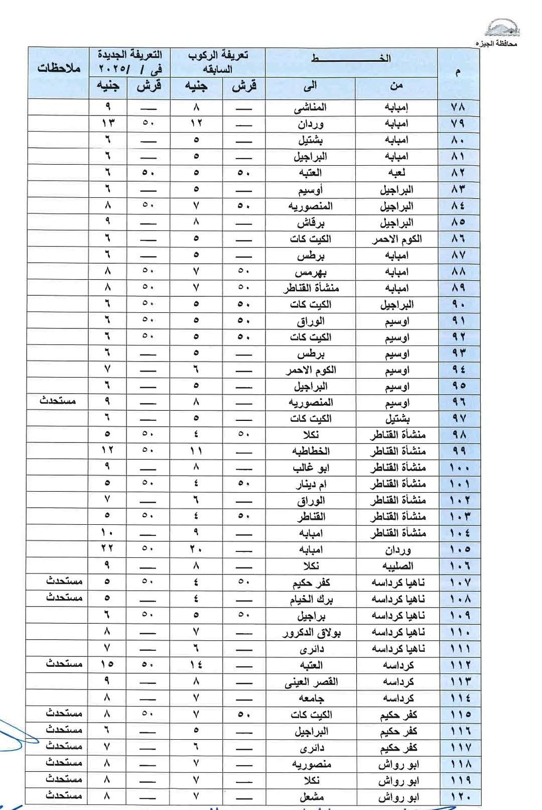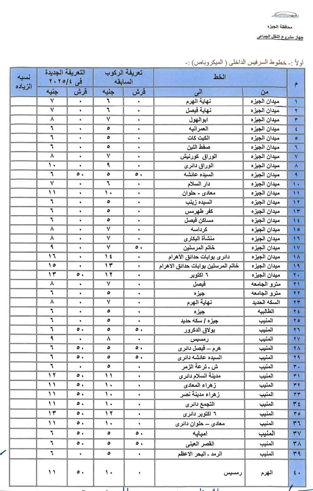 اعتمد المهندس عادل النجار محافظ الجيزة التعريفة الجديدة لسيارات السرفيس والنقل الجماعي الداخلية والخارجية والتي يتم تطبيقها اعتبارًا من اليوم الجمعة وطبقًا للجداول المرفقة وذلك في ضوء قرار لجنة التسعير التلقائي للمنتجات البترولية بوزارة البترول بتحريك أسعار المنتجات البترولية.