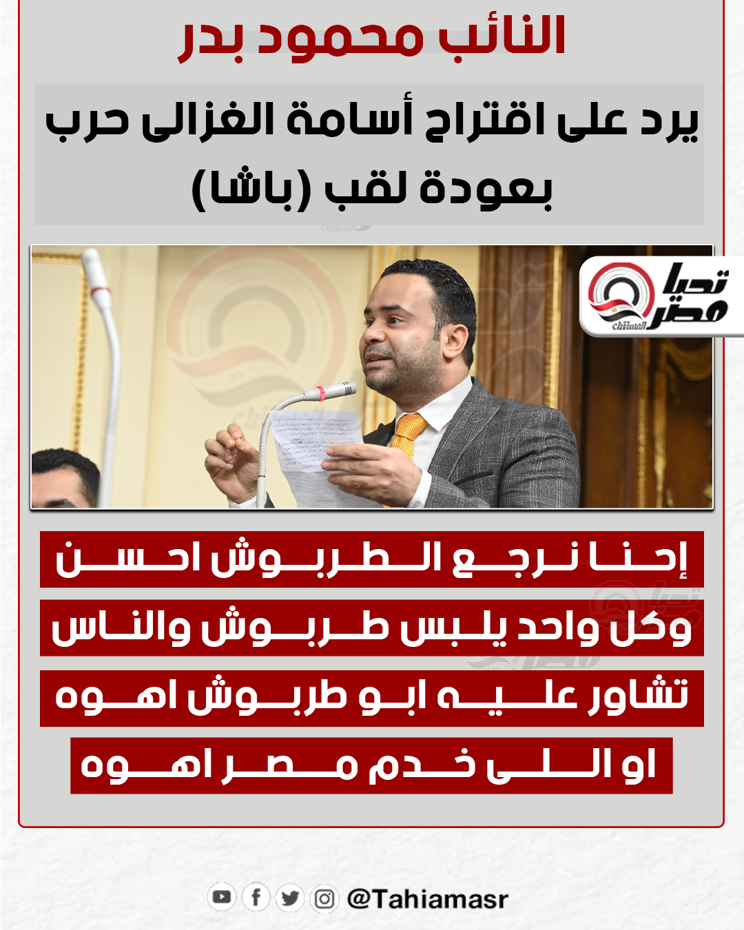 واقترح النائب – ساخرًا – بديلًا دستوريًا لتكريم المتميزين، قائلًا: "عشان منقعش في فخ المنع الدستوري، بلاش نرجّع الألقاب دي، لكن ممكن نرجّع الطربوش بس"، مضيفًا: "كل واحد من اللي الدكتور أسامة شايف إنهم يستحقوا اللقب يلبس طربوش، وساعتها هيبقى علامة مميزة.. كل ما يمشي في الشارع الناس هتشاور عليه وتقول: أبو طربوش، قصدي اللي خدم مصر!"