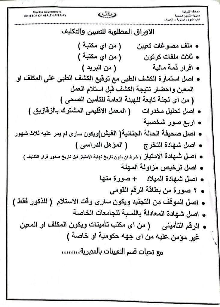 وتهيب مديرية الشئون الصحية بالشرقية بجميع السادة الأطباء المكلفين المشمولين بالقرار، التوجه إلى المديرية خلال هذه الأيام، وتقديم مصوغات التعيين من الساعة ٩ صباحاً وحتى الساعة ١٢ ظهراً، مع ضرورة إحضار نتيجة الكشف الطبي، والالتزام الكامل بالتعليمات التنظيمية والإدارية، مع تمنياتنا لهم بالتوفيق والسداد في مواقع عملهم الجديدة.