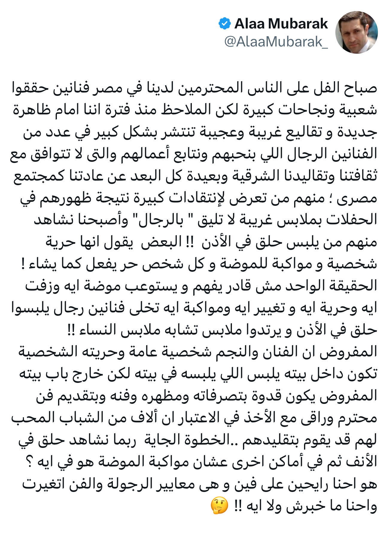 وقال علاء مبارك: "صباح الفل على الناس المحترمين، لدينا في مصر فنانين حققوا نجاحات وشعبية كبيرة، لكن الملاحظ في الفترة الأخيرة هو انتشار تقاليع غريبة بين عدد من الفنانين الرجال، الذين نحبهم ونتابع أعمالهم، لكنها لا تتوافق مع ثقافتنا وتقاليدنا الشرقية".