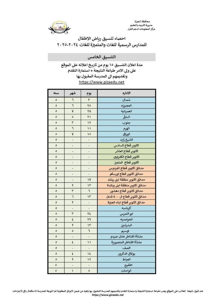 ظهر الآن التنسيق الخامس لنتيجة الصف الأول لمرحلة رياض الأطفال بالمدارس الرسمية والمتميزة للغات فى محافظة الجيزة والذى يترقبه الكثير من أولياء الأمور حيث اطلع المهندس عادل النجار محافظ الجيزة علي تقرير سعيد عطية وكيل وزارة التربية والتعليم بمحافظة الجيزة والخاص بإعلان التنسيق الخامس لنتيجة الصف الأول رياض الأطفال للمدارس الرسمية للغات و المتميزة للغات للعام الدراسى 2024 / 2025.