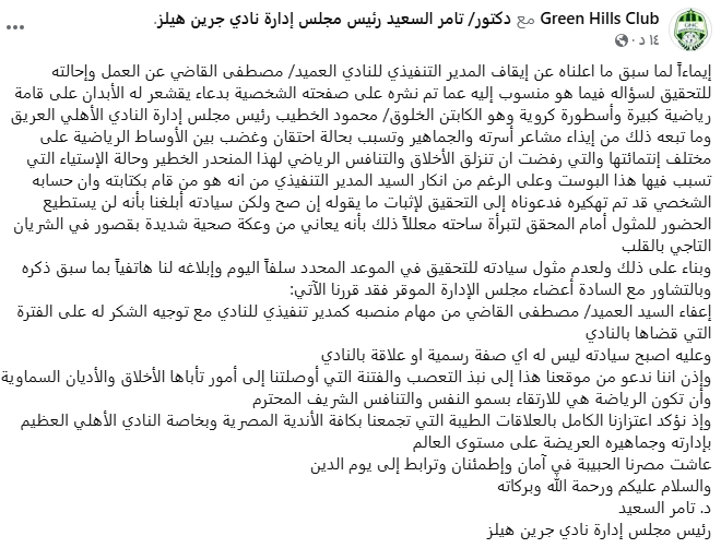 بعد التجاوز في حق رئيس الأهلي.. نادي جرين هيلز يقرر إعفاء الدكتور مصطفى القاضي من منصب المدير التنفيذي