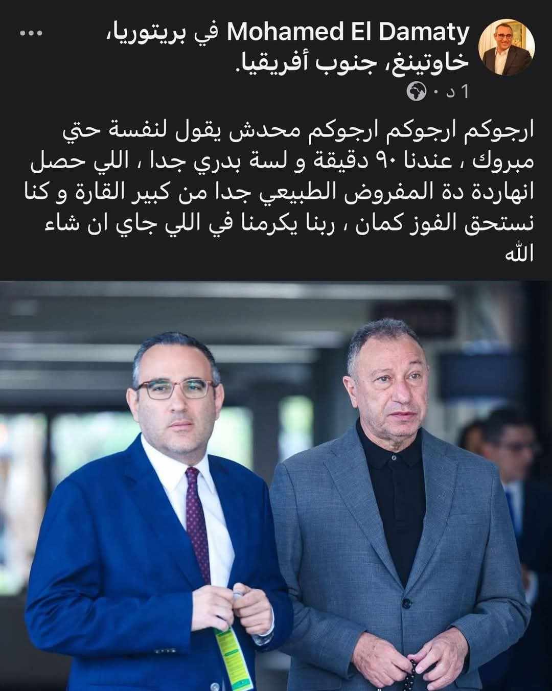 وكتب محمد الدماطي في رسالة عبر فيس بوك، أرجوكم أرجوكم أرجوكم محدش يقول لنفسه حتى مبروك، عندنا 90 دقيقة ولسه بدري جداً وللي حصل النهاردة ده المفروض الطبيعي جداً من كبير القارة.