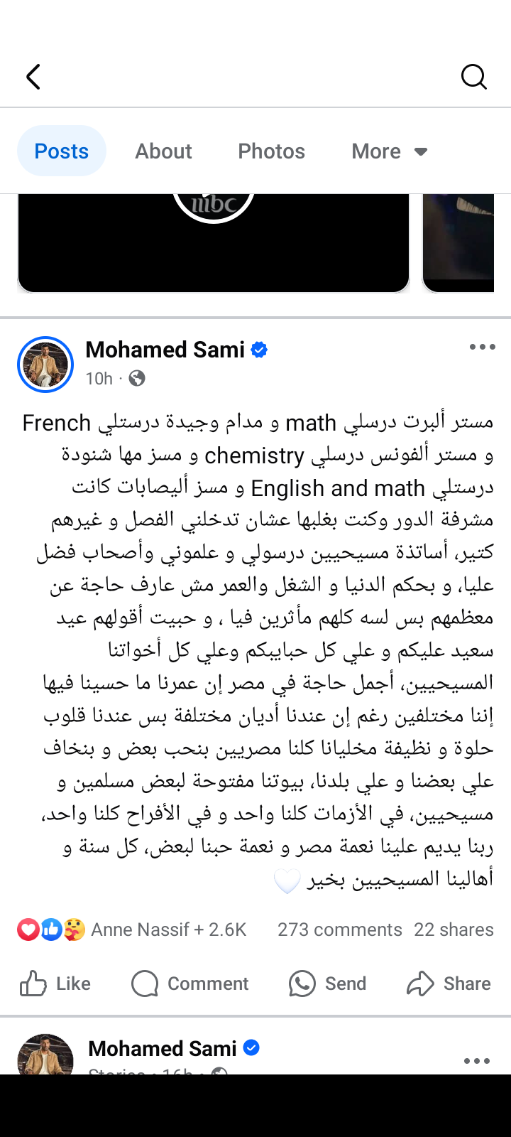 وتابع محمد سامي حديثه، قائلا: حبيت أقولهم عيد سعيد عليكم و علي كل حبايبكم وعلي كل أخواتنا المسيحيين، أجمل حاجة في مصر إن عمرنا ما حسينا فيها إننا مختلفين رغم إن عندنا أديان مختلفة بس عندنا قلوب حلوة و نظيفة مخليانا كلنا مصريين بنحب بعض و بنخاف علي بعضنا و علي بلدنا، بيوتنا مفتوحة لبعض مسلمين و مسيحيين، في الأزمات كلنا واحد و في الأفراح كلنا واحد، ربنا يديم علينا نعمة مصر و نعمة حبنا لبعض، كل سنة و أهالينا المسيحيين بخير.