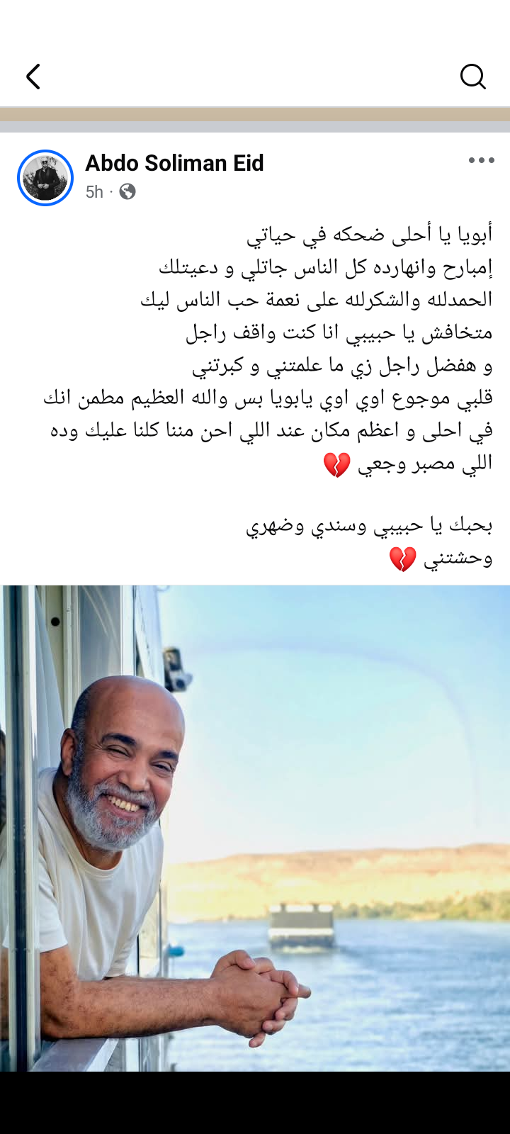 وكتب نجل سليمان عيد في منشور رصده موقع تحيا مصر عبر حسابه الرسمي بموقع التواصل الاجتماعي فيسبوك: ابويا يا أحلى ضحكه في حياتي إمبارح وانهارده كل الناس جاتلي و دعيتلك الحمدلله والشكرلله على نعمة حب الناس ليك.. متخافش يا حبيبي انا كنت واقف راجل و هفضل راجل زي ما علمتني و كبر قلبي موجوع اوي اوي يابويا بس والله العظيم مطمن انك في احلى و اعظم مكان عند اللي احن مننا كلنا عليك وده اللي مصبر وجعي بحبك يا حبيبي وسندي وضهري وحشتني.