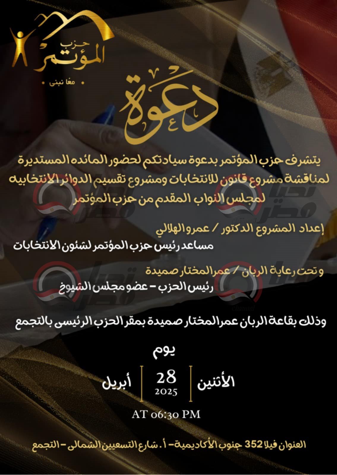 خاص لتحيا مصر.. تفاصيل وصورة دعوة الأحزاب لمناقشة أول مشروع قانون لتقسيم الدوائر الانتخابية المُعد من "المؤتمر"