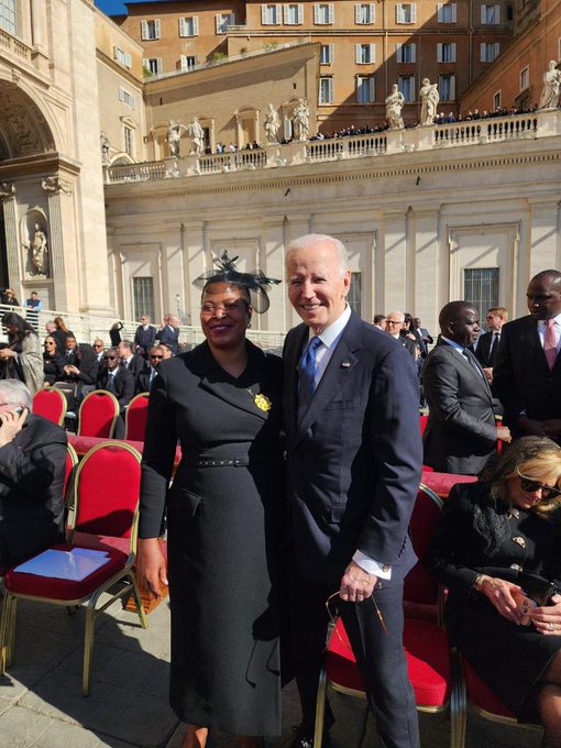 وفي الصورة، يظهر بايدن مع الرئيس الكيني ويليام روتو في ساحة القديس بطرس بمدينة الفاتيكان، خلال جنازة البابا فرانسيس مبتسماً كما التقط صورة مع رئيسة البرلمان أنيتا أمونغ، ونائبها توماس تايبوا، ومسؤولون حكوميون أوغنديون آخرون.