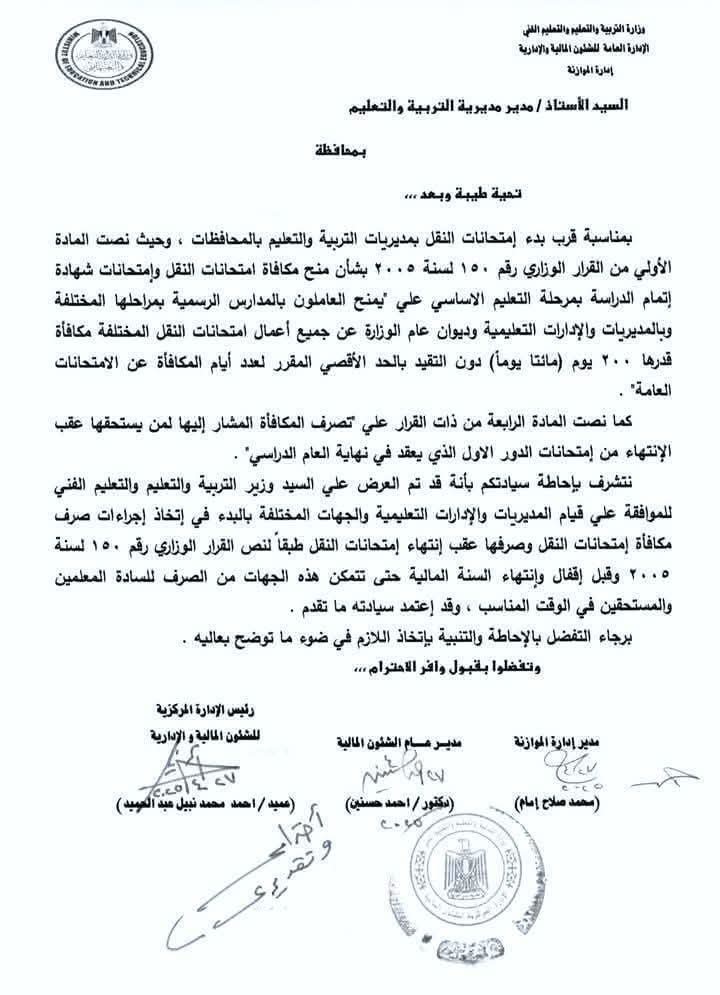 واكدت الوزارة من خلال الخطاب الذى رصده موقع تحيا مصر :كما نصت المادة الرابعة من ذات القرار علي تصرف المكافأة المشار إليها لمن يستحقها عقب الإنتهاء من إمتحانات الدور الأول الذي يعقد في نهاية العام الدراسي، وأنه قد تم العرض علي وزير التعليم للموافقة علي قيام المديريات والإدارات التعليمية والجهات المختلفة بالبدء في إتخاذ إجراءات صرف مكافأة إمتحانات النقل وصرفها عقب إنتهاء إمتحانات النقل طبقاً لنص القرار الوزاري رقم ١٥٠ لسنةك ٢٠٠٥ وقبل تقفيل وإنتهاء السنة المالية حتى تتمكن هذه الجهات من الصرف للمعلمين والمستحقين في الوقت المناسب ، وقد اعتمد الوزير ما تقدم.