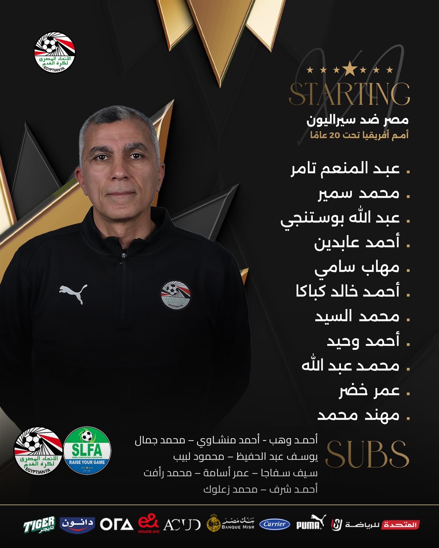 أعلن الجهاز الفني لمنتخب مصر تحت 20 سنة بقيادة أسامه نبيه التشكيل الأساسي الذي يبدأ به مباراة منتخب سيراليون في الجولة الثانية بالمجموعة الأولى والذي ينطلق في تمام التاسعة مساء اليوم (الأربعاء) على ملعب هيئة قناة السويس بالإسماعيلية.