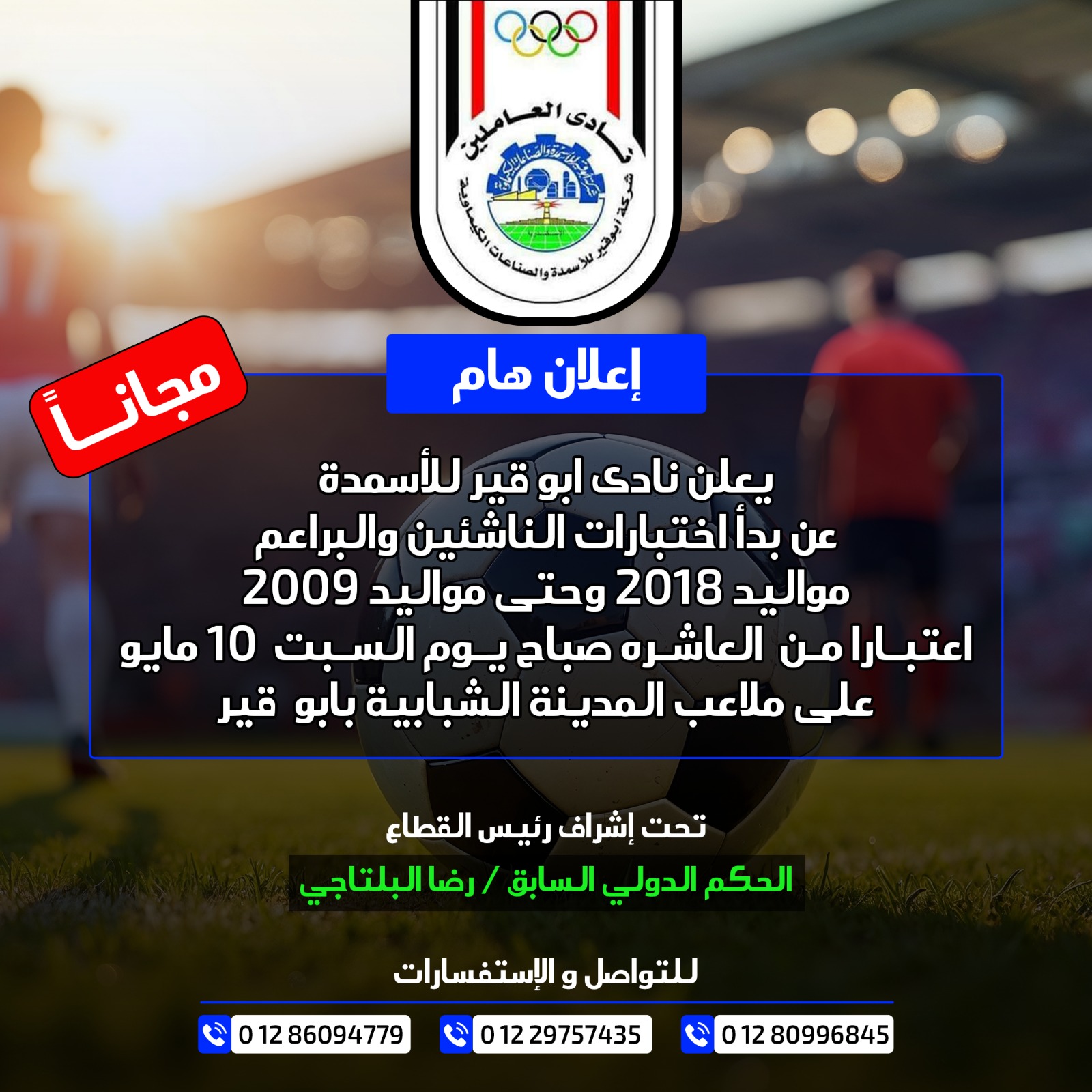 في العاشر من مايو الجاري، تشهدت ملاعب المدينة الشبابية بأبو قير حدثًا رياضيًا مميزًا، حيث أطلق نادي أبو قير للأسمدة اختبارات لاكتشاف المواهب الرياضية بين الناشئين والبراعم من مواليد عام 2009 حتى 2018، تحت إشراف الحكم الدولي السابق ورئيس قطاع الناشئين بالنادى، الكابتن رضا البلتاجي.