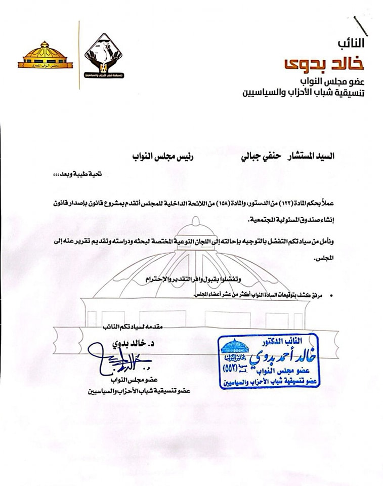 نائب التنسيقية خالد بدوي يتقدم بمشروع قانون لإنشاء صندوق للمسؤولية المجتمعية في مصر