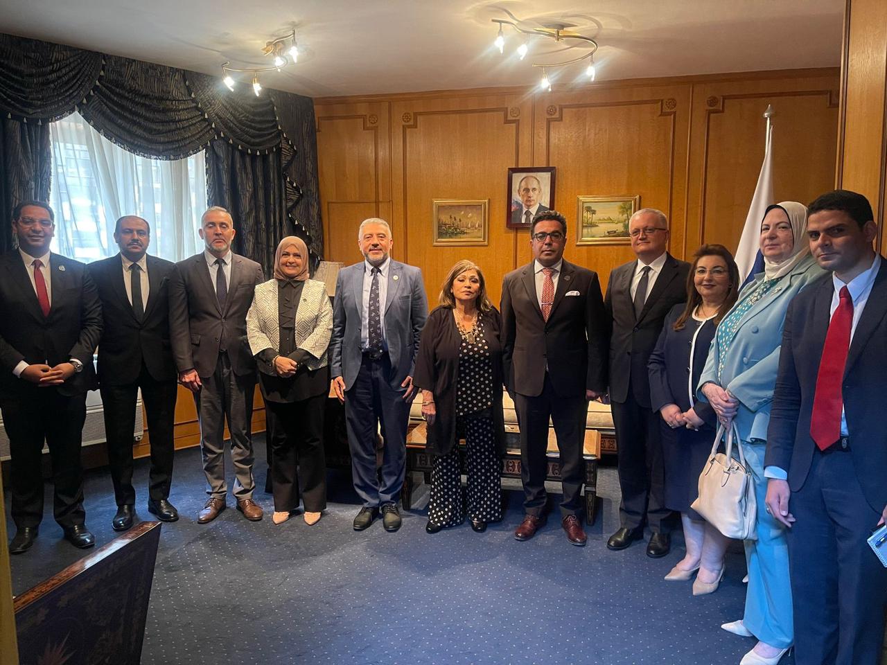 وضم وفد الحزب كلاً من المهندس حسام الدين علي، النائب الأول لرئيس الحزب، والنائبة البرلمانية السابقة مارجريت عازر، نائب رئيس الحزب، ومساعدي رئيس الحزب السفيرة منى عمر، والاستاذة راندا حلاوة، والدكتور رامي زهدي، و رئيس اتحاد المرأة الأستاذة نادية عز الدين، إلى جانب المهندس عبدالله العياشي رئيس اتحاد الشباب بالحزب، والأستاذ هيثم الفقي رئيس لجنة العلاقات الخارجية باتحاد الشباب.