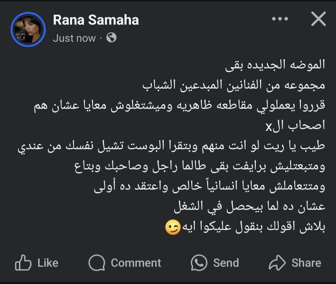 وكتبت رنا سماحة في منشورها الذي يرصده موقع تحيا مصر: مجموعة من الفنانين المبدعين الشباب قرروا يعملولي مقاطعة ظاهريه وميشتغلوش معايا عشان هما أصحاب الx.. طيب يا ريت لو أنت منهم وبتقرا البوست تشيل نفسك من عندي ومتبعتليش برايفت بقى طالما راجل وصاحبك وبتاع.. ومتتعاملش معايا انسانياً خالص واعتقد ده أولى عشان ده لما بيحصل في الشغل بلاش اقولك بنقول عليكوا ايه.