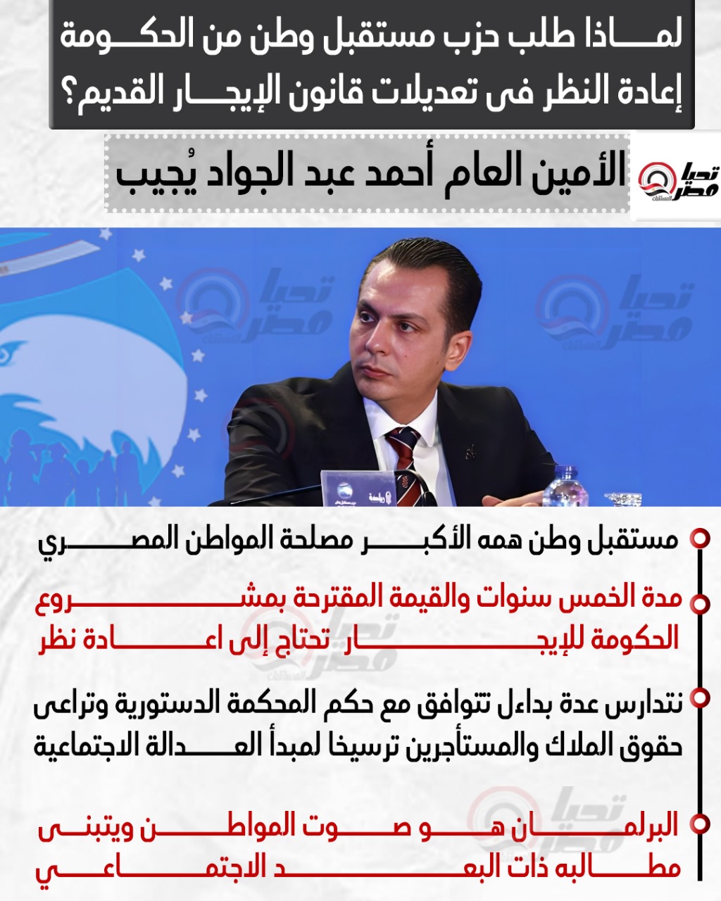 وأضاف الأمين العام أن حزب مستقبل وطن بصدد دراسة عدد من البدائل القانونية والعملية التي تحقق هذا التوازن المنشود، مشيراً إلى أن المقترح الحكومي بتحديد مدة انتقالية مدتها خمس سنوات وقيمة إيجارية محددة لا يعكس بشكل كافٍ طبيعة الوضع الاجتماعي والاقتصادي لشرائح واسعة من المواطنين، لا سيما كبار السن وأصحاب المعاشات والأسر محدودة الدخل.
