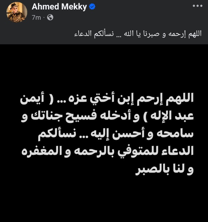 أثار نبأ وفاة نجل شقيقة أحمد مكي حالة من الحزن عبر مواقع التواصل الاجتماعي، حيث أعلن الفنان أحمد مكي عبر حسابه الرسمي على موقع فيسبوك وفاة نجل شقيقته أيمن عبد الإله، في منشور مؤثر طلب فيه من جمهوره الدعاء للراحل بالرحمة والمغفرة، ولأسرته بالصبر والسلوان، وتفاعل عدد كبير من نجوم الفن مع منشور أحمد مكي الذي جاء حزين ومؤثر.