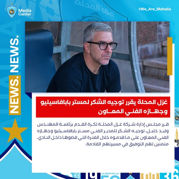 قرر مجلس إدارة شركة غزل المحلة لكرة القدم، برئاسة المهندس حسام عزو، توجيه الشكر للمدير الفني مستر بابافاسيليو وجهازه الفني المعاون على ما قدموه خلال الفترة التي تواجدوا فيها داخل النادي.