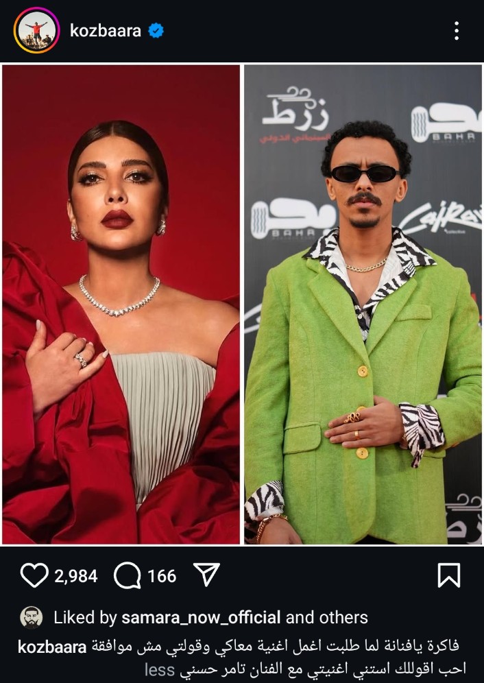 نشر مغني المهرجانات أحمد بحر الشهير بـ كزبرة صورة له والمطربة التونسية أصالة نصري عبر حسابه الرسمي على موقع تبادل الصور والفيديوهات انستجرام وعلق عليها موجه العتاب لأصالة بسبب رفضها الغناء معه من قبل، ونرصد فيما يأتي رسالة عتاب كزبرة إلى أصالة.