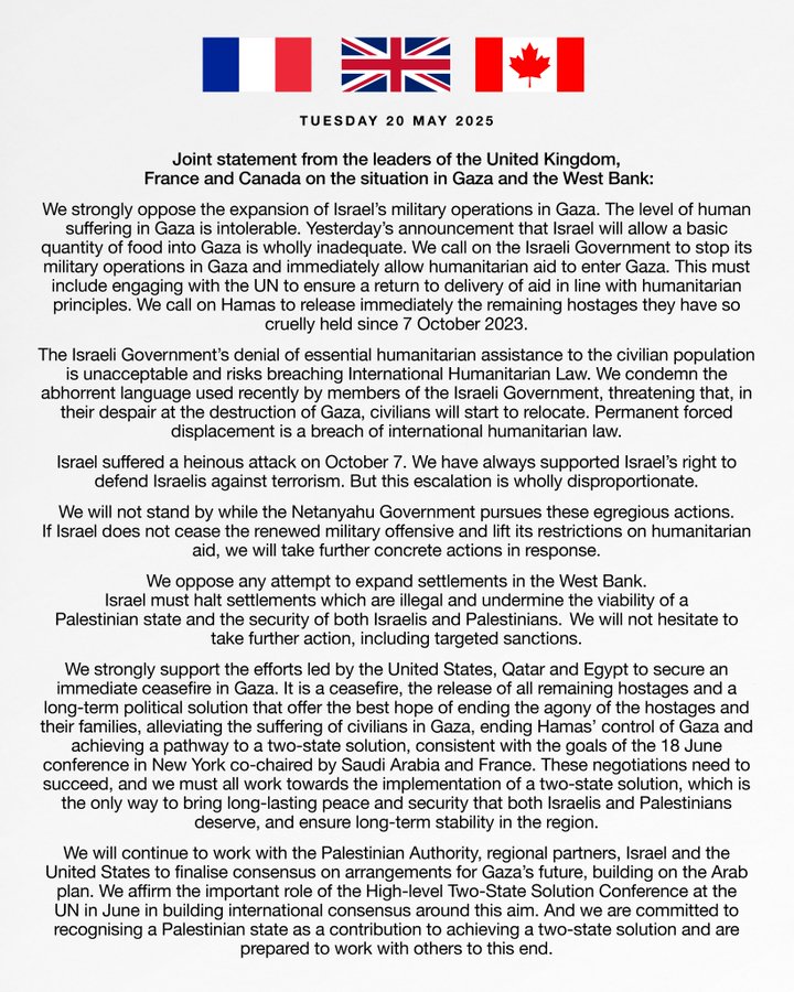 وأضاف البيان المشترك:" لن نقف مكتوفي الأيدي بينما تواصل حكومة نتنياهو هذه الأعمال الشنيعة. إذا لم توقف إسرائيل هجومها العسكري المتجدد وترفع قيودها على المساعدات الإنسانية، فسنتخذ المزيد من الإجراءات الملموسة ردًا على ذلك. نعارض أي محاولة لتوسيع المستوطنات في الضفة الغربية. يجب على إسرائيل وقف بناء المستوطنات غير القانونية التي تقوض قابلية بقاء الدولة الفلسطينية وأمن كل من الإسرائيليين والفلسطينيين. لن نتردد في اتخاذ المزيد من الإجراءات، بما في ذلك فرض عقوبات محددة".