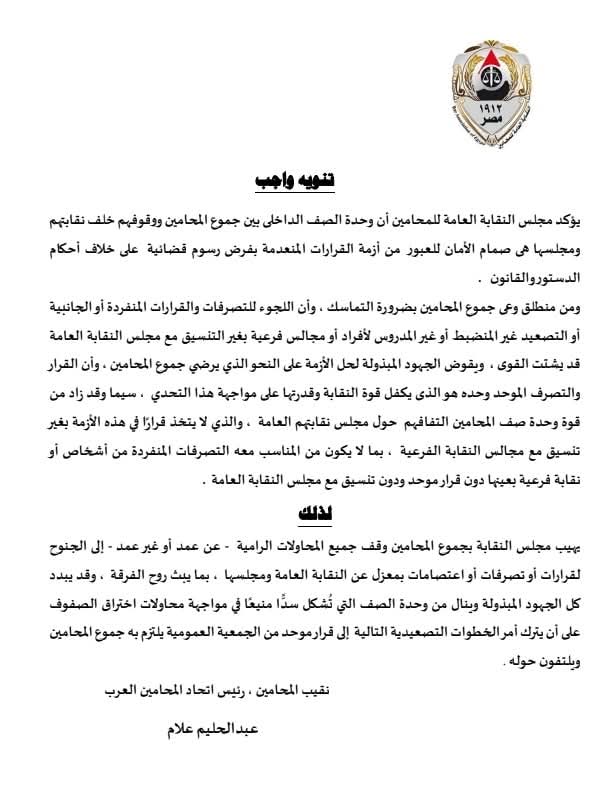 وأضاف :" من منطلق وعى جموع المحامين بضرورة التماسك، وأن اللجوء للتصرفات والقرارات المنفردة أو الجانبية أو التصعيد غير المنضبط أو غير المدروس لأفراد أو مجالس فرعية بغير التنسيق مع مجلس النقابة العامة قد يشتت القوى، ويقوض الجهود المبذولة لحل الأزمة على النحو الذي يرضي جموع المحامين ، وأن القرار والتصرف الموحد وحده هو الذى يكفل قوة النقابة وقدرتها على مواجهة هذا التحدي ، سيما وقد زاد من قوة وحدة صف المحامين التفافهم حول مجلس نقابتهم العامة، والذي لا يتخذ قرارًا في هذه الأزمة بغير تنسيق مع مجالس النقابة الفرعية، بما لا يكون من المناسب معه التصرفات المنفردة من أشخاص أو نقابة فرعية بعينها دون قرار موحد ودون تنسيق مع مجلس النقابة العامة.