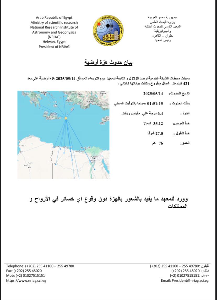 شعرت مصربـ هزتين أرضيتين خلال 8 أيام وهو ما أقلق المواطنين، وكانت الهزة الأرضية الأولى يوم 14 مايو الماضي، بينما كانت الهزة الثانية صباح اليوم الخميس، ولم تحدث هناك أي خسائر في الأرواح أو الممتلكات، ويستعرض موقع تحيا مصر الفارق بين الزلزالين بالأرقام، بناء على المعهد القومي للبحوث الفلكية والجيوفيزيقية.