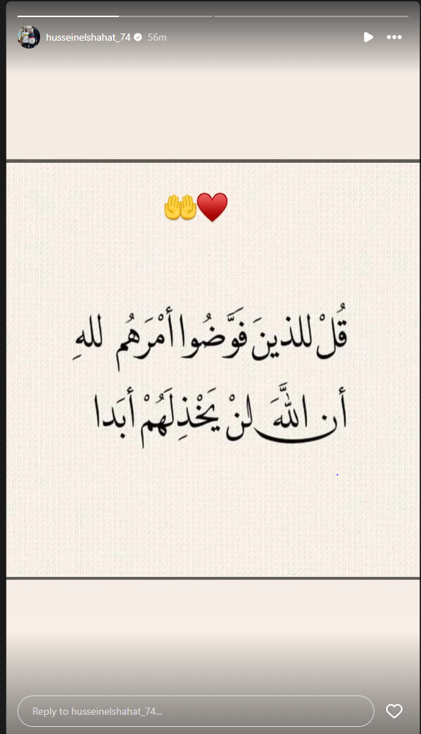 تحيا مصر، ونشر حسين الشحات لاعب الأهلي رسالة معلقاً:" قل للذين فوضوا أمرهم لله ان الله لن يخذلهم أبدا".