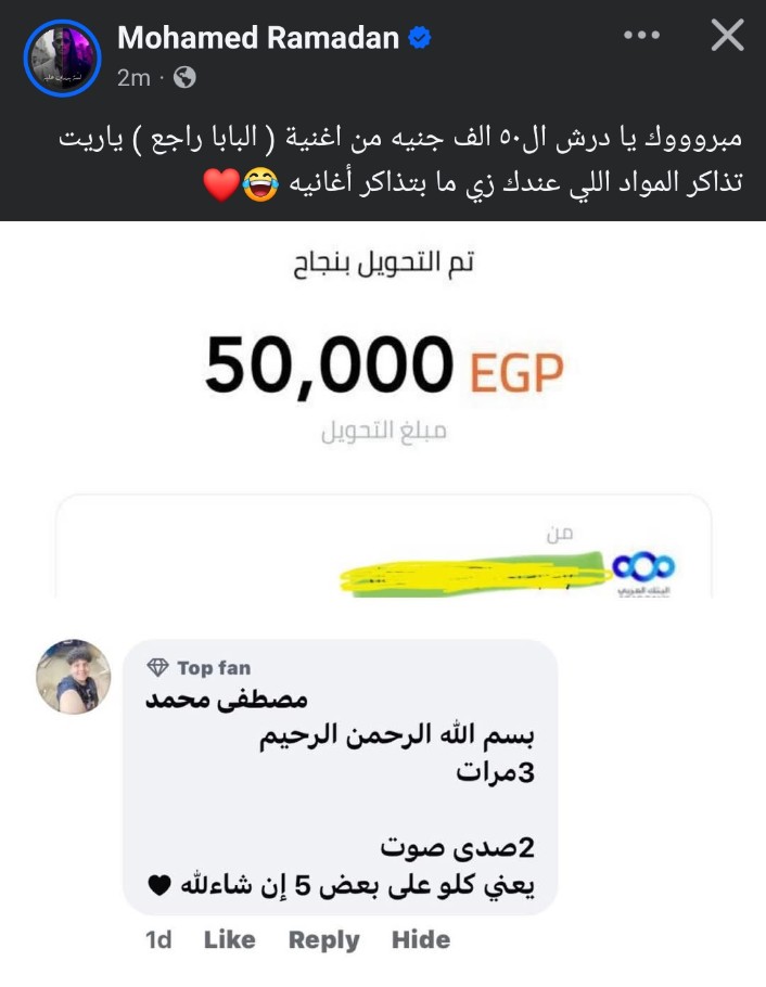 أعلن الفنان محمد رمضان عن الفائز في مسابقته الأخيرة عن أغنية البابا راجع، من خلال منشور عبر حسابه الرسمي على موقع التواصل الاجتماعي فيسبوك وكتب موجهًا رسالة للفائز قائلًا: "مبروووك يا درش الـ50 ألف جنيه من أغنية (البابا راجع)، ياريت تذاكر المواد اللي عندك زي ما بتذاكر أغانيه"، وقد أثار هذا المنشور الذي يرصده موقع تحيا مصر تفاعلاً واسعاً بين متابعي محمد رمضان، الذين رأوا في كلماته مزيجاً ذكياً من الدعابة والتشجيع على الاهتمام بالتعليم، خاصة وأن جمهوره يضم شريحة كبيرة من الشباب والمراهقين واختار رمضان أن يوظف شعبيته الواسعة وتأثيره القوي على جمهوره ليُذكر بأهمية المذاكرة والتفوق الدراسي، حتى في خضم أجواء الفن والترفيه.