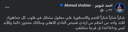 وكتب أحمد شوبير في رسالته عبر فيس بوك، شكراً شكراً شكراً للنجم والاسطورة علي معلول ستظل في قلوب كل جماهيرك للابد واحد من اعظم من ارتدي قميص النادي الاهلي ومكانك محجوز دائما وللأبد ليس وداعا ابدا بل قريبا سنلتقي.