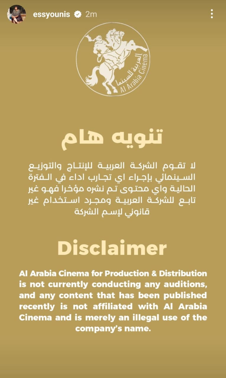 وجاء البيان الذي يرصده موقع تحيا مصر كالآتي: تنويه هام لا تقوم الشركة العربية للإنتاج والتوزيع السينمائي بإجراء اي تجارب اداء في الفترة الحالية واي محتوى تم نشره مؤخرا فهو غير تابع للشركة العربية ومجرد استخدام غير قانوني لإسم الشركة.