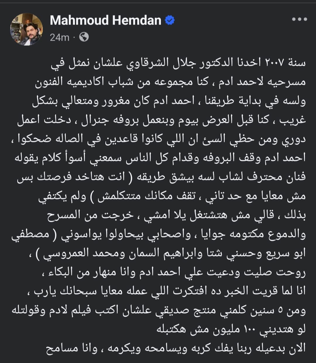 وأعاد محمود حمدان نشر تصريح لـ أحمد آدم يشتكي فيه من إهمال الوسط الفني له، وعلق حمدان في منشوره الذي يرصده موقع تحيا مصر: سنة 2007 اخدنا الدكتور جلال الشرقاوي علشان نمثل في مسرحيه لاحمد ادم، كنا مجموعه من شباب اكاديميه الفنون ولسه في بداية طريقنا، احمد ادم كان مغرور ومتعالي بشكل غريب ، كنا قبل العرض بيوم وبنعمل بروفه جنرال.