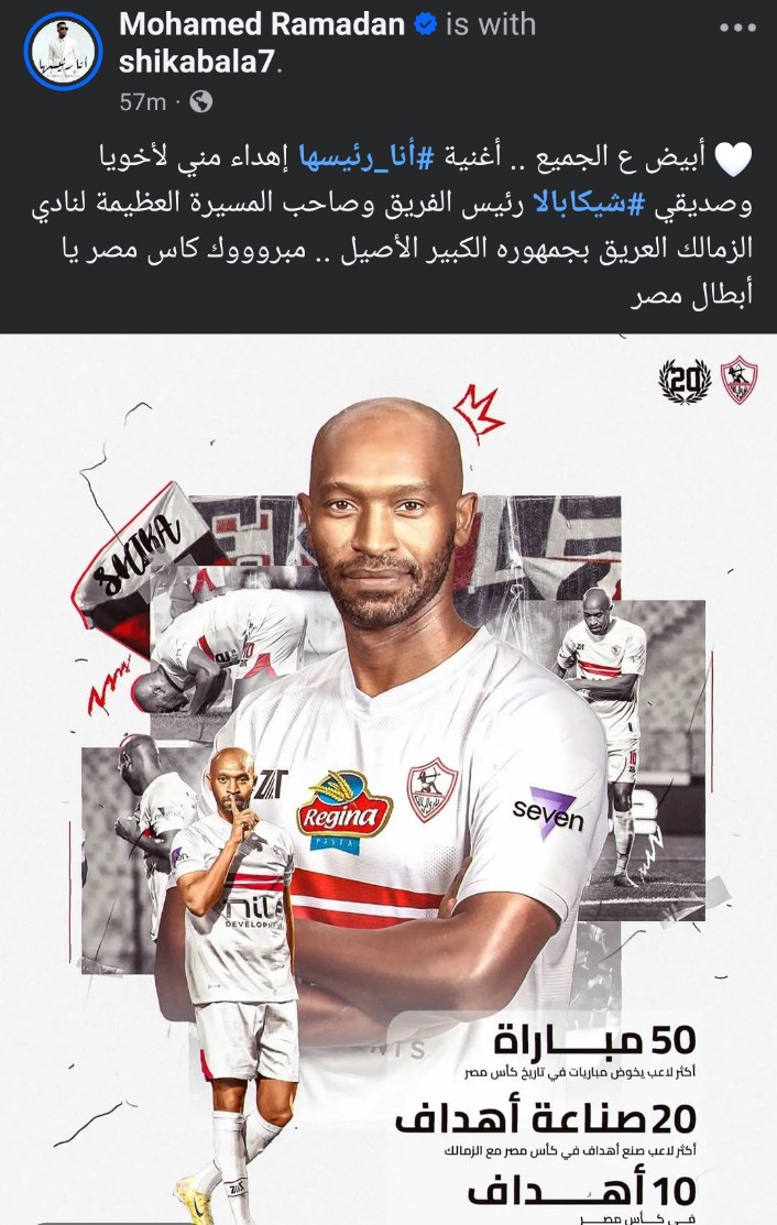 نشر محمد رمضان صورة احتفال اللاعب شيكابالا عبر حسابه الرسمي على موقع التواصل الاجتماعي فيسبوك وعلق عليها وأعلن إهداء أغنيته الأخيرة أنا رئيسها لشيكابالا بعد فوزه، وقال محمد رمضان وفقًا لما يرصده موقع تحيا مصر :أبيض ع الجميع .. أغنية أنا رئيسها إهداء مني لأخويا وصديقي شيكابالا رئيس الفريق وصاحب المسيرة العظيمة لنادي الزمالك العريق بجمهوره الكبير الأصيل، مبروك كاس مصر يا أبطال مصر"، جدير بالذكر أن أغنية أنا رئيسها كان طرحها محمد رمضان منذ بضعة أيام وحصدت ملايين المشاهدات عبر مختلف منصات الاستماع الإلكترونية ومنصة الفيديوهات الشهيرة يوتيوب وانهالت التعليقات على منشور محمد رمضان من جمهور نادي الزمالك الذين عبروا عن سعادتهم بلفتة محمد رمضان المؤثرة.