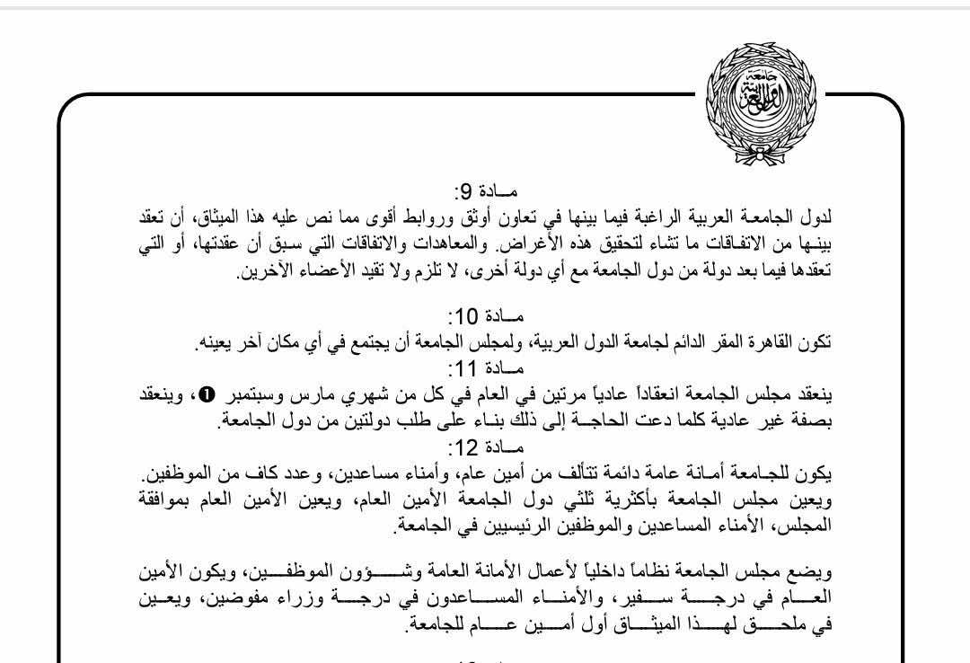 كما ينص الميثاق في المادة 11 على أن يكون مقر الجامعة في القاهرة، ويحق لمجلس الجامعة أن يجتمع في أي مكان آخر يتم الاتفاق عليه. وينعقد المجلس اجتماعيًا مرتين في العام (مارس وسبتمبر)، أو بشكل غير عادي إذا طلبت ذلك دولتان من الدول الأعضاء.