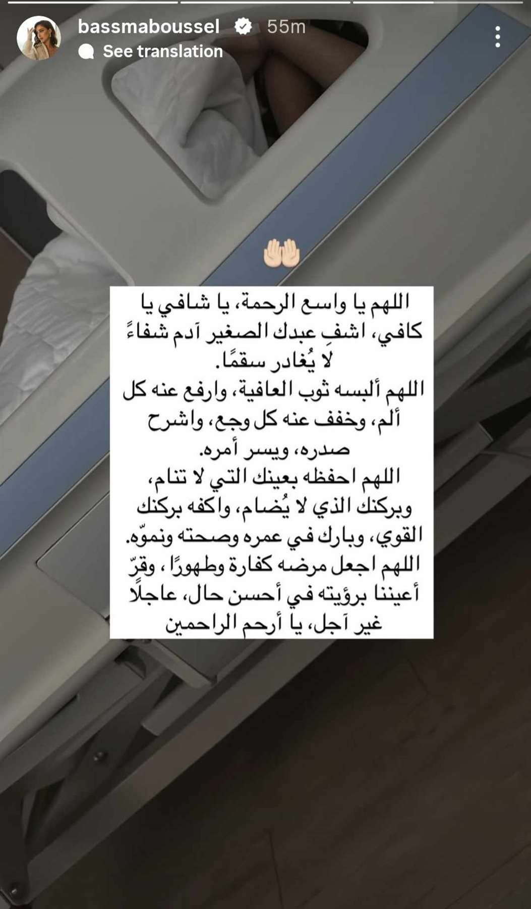 ونشرت بسمة بوسيل من خلال خاصية استوري صورة لآدم وهو على سرير المستشفى رصدها موقع تحيا مصر، وعلقت عليها وكتبت: اللهم يا واسع الرحمة، يا شافي يا كافي، اشف عبدك الصغير آدم شفاء لا يغادر سقما، اللهم ألبسه ثوب العافية، وارفع عنه كل ألم، وخفف عنه كل وجع، واشرح صدره، ويسر أمره، اللهم احفظه بعينك التي لا تنام وبركنك الذي لا يُضام، واكفه بركنك القوي، وبارك في عمره وصحته ونموه، اللهم اجعل مرضه كفارة وطهورا ، وقرّ أعيننا برؤيته في أحسن حال، عاجلا غير أجل، يا أرحم الراحمين.