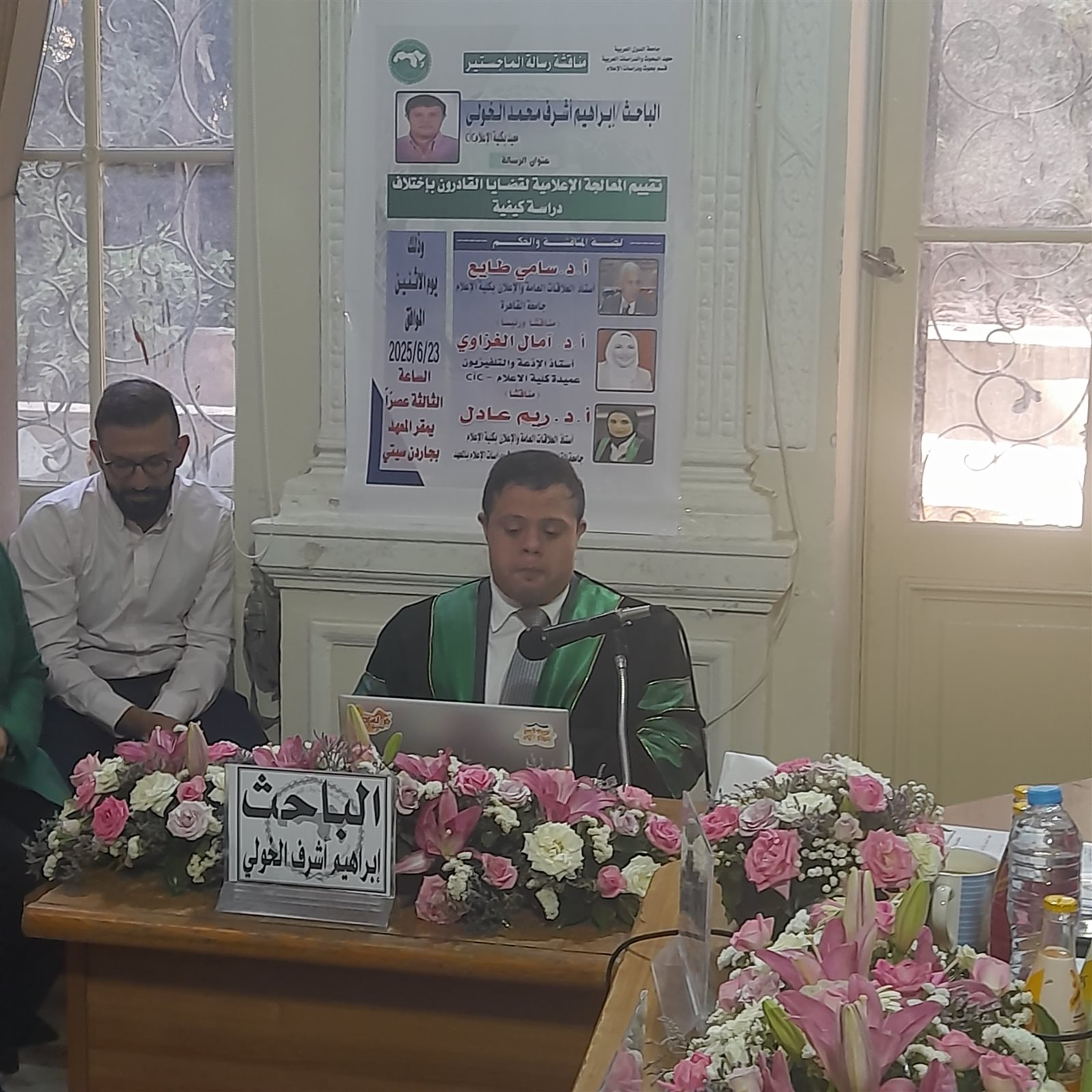 شهدت كلية الإعلام بجامعة القاهرة لحظة استثنائية وإنسانية ملهمة، حيث ناقش الطالب إبراهيم أشرف محمد الخولي، من أصحاب متلازمة داون، أول رسالة ماجستير من نوعها على مستوى الجامعة، في إنجاز غير مسبوق يعكس قوة الإرادة والدمج الحقيقي في التعليم العالي.